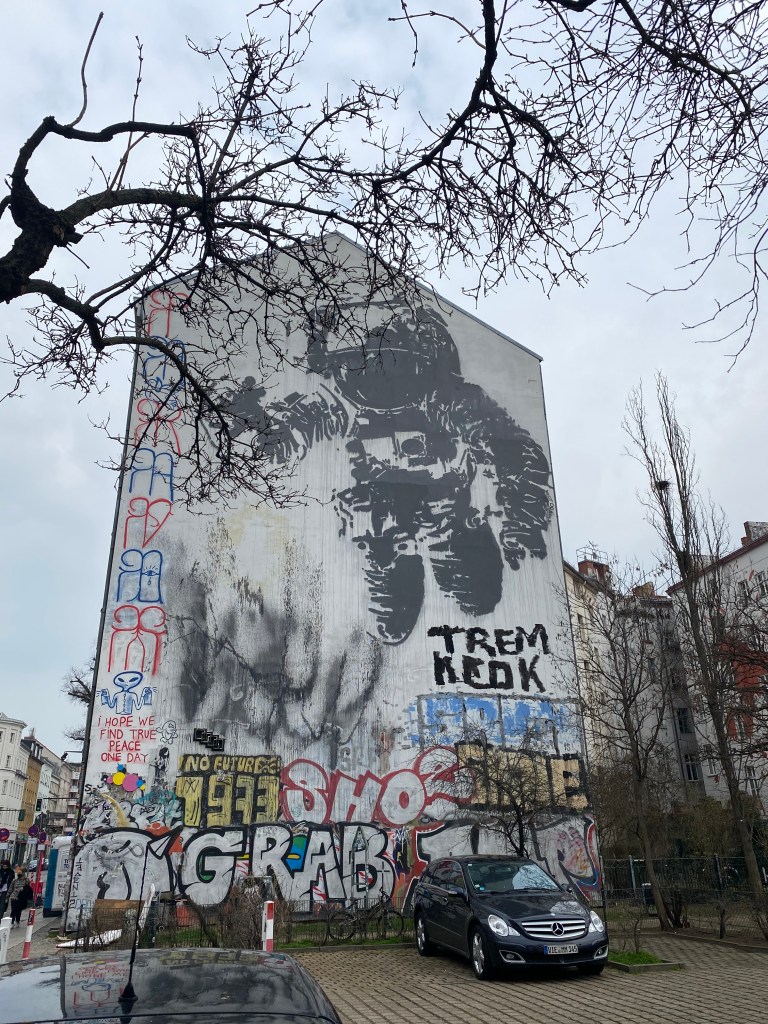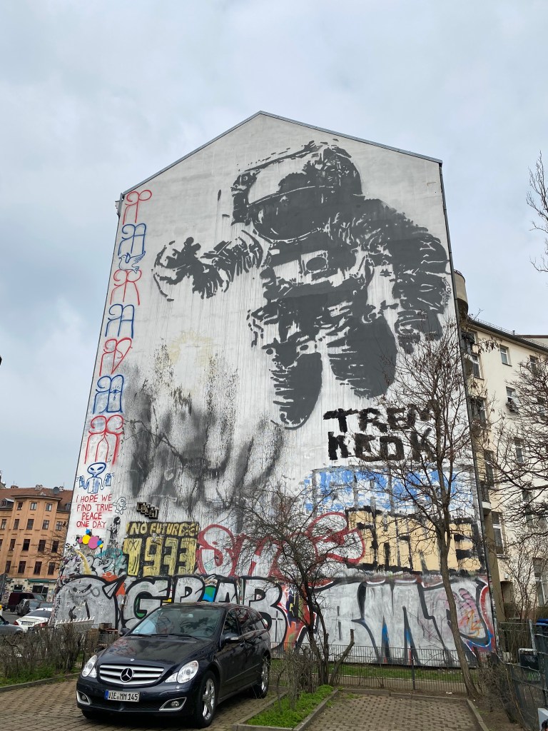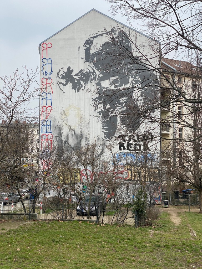The classic mural in black and white features an oversized astronaut hovering over the city in his space gear. There is no face visible behind the helmet, just a black area. He seems to indicate something with his hand. The patch on his sleeve does not reveal a clear nationality.
