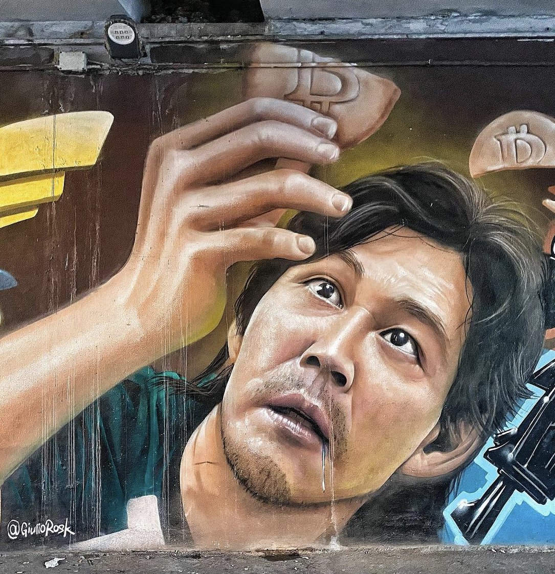 This wonderful piece of art by street artist Giulio Rosk is dedicated to the smashing, and also widely disturbing TV series Squide Game. The painting in Milan, Italy, shows lead character Seong Gi-hun, played by Lee Jung-jae, who is holding up a dalgona candy.