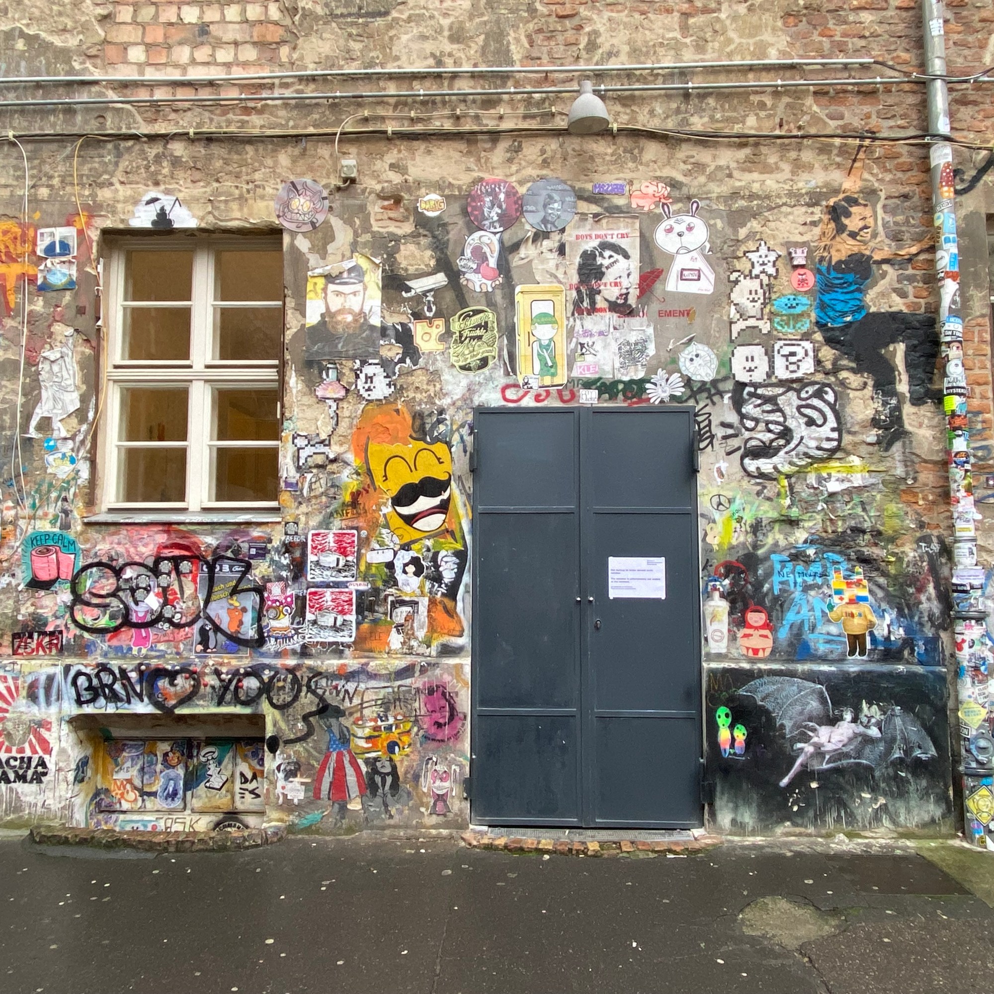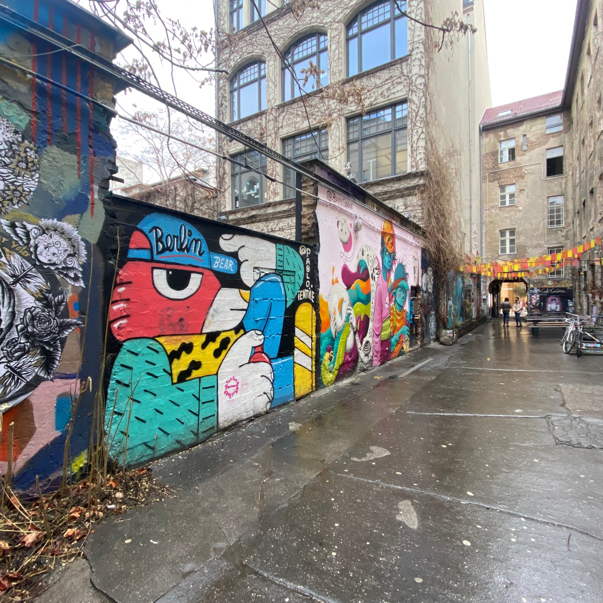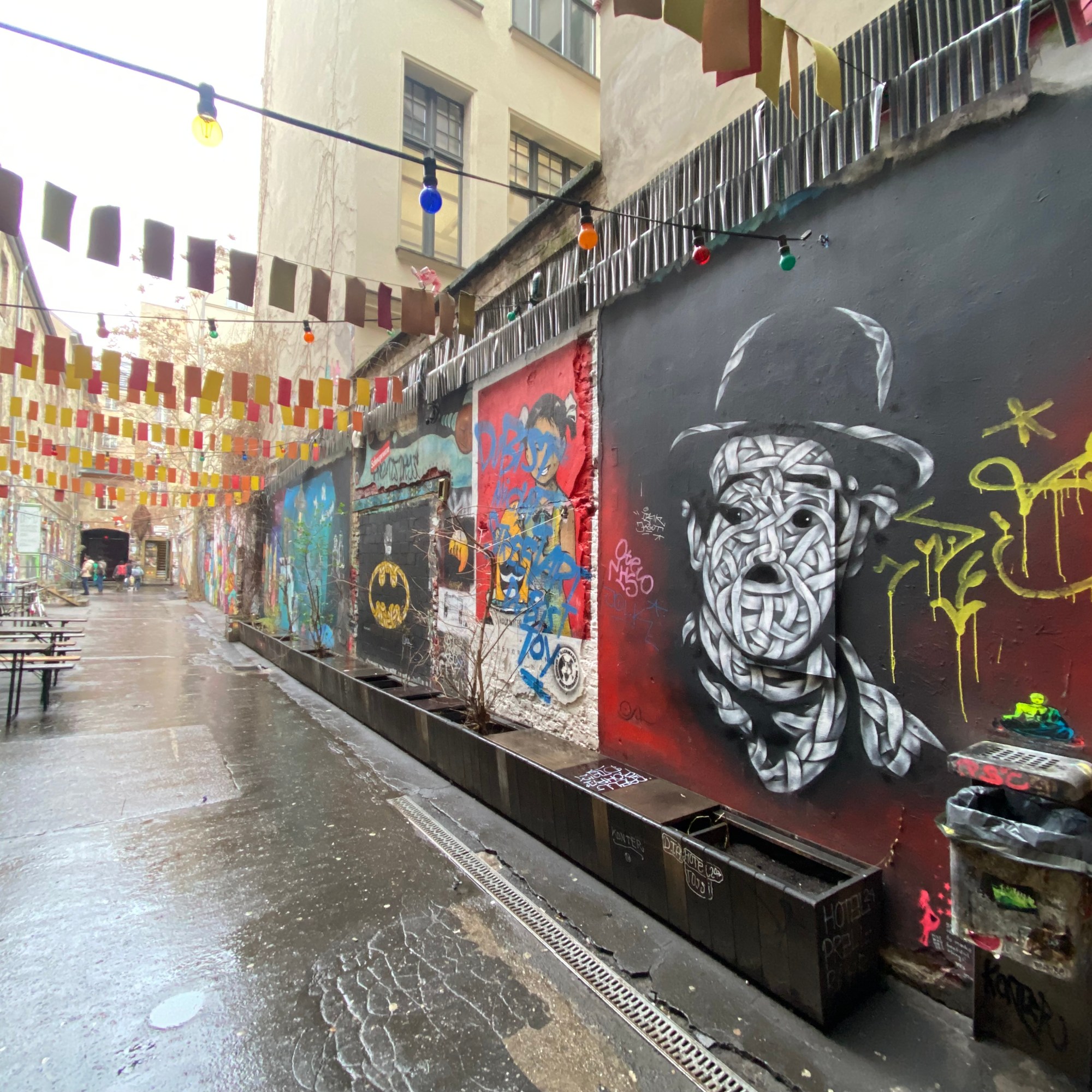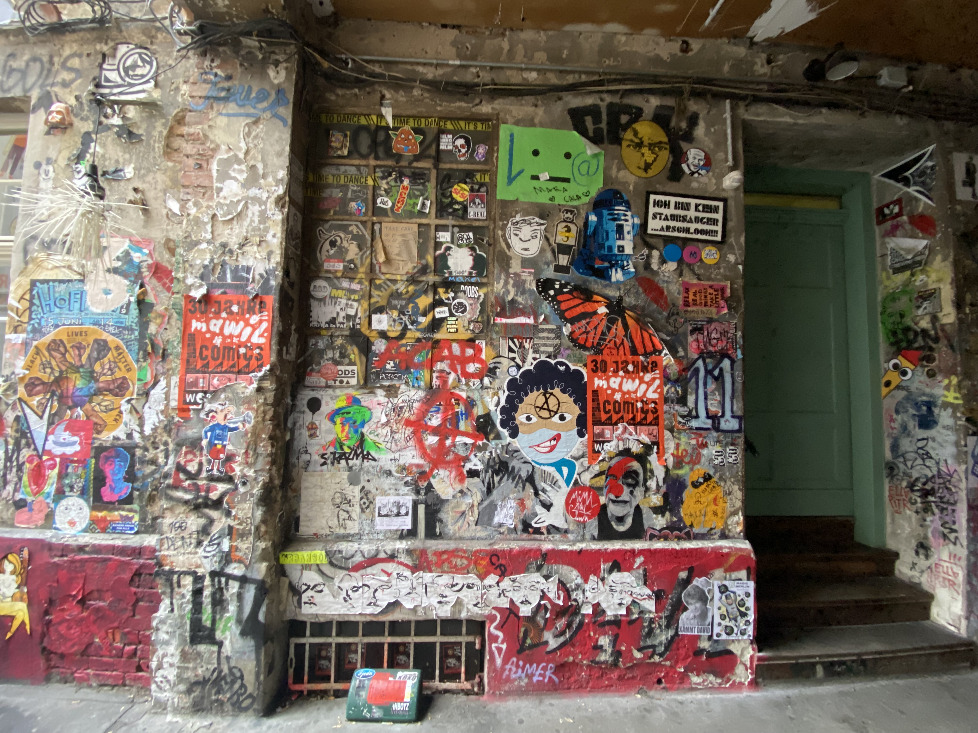 The tunnel is coated with paper and most colorful artwork. The whole yard is a protected space for historic reasons. Painting on the walls is actually illegal; but still the entire right hand side of the yard is covered with Street Art.
