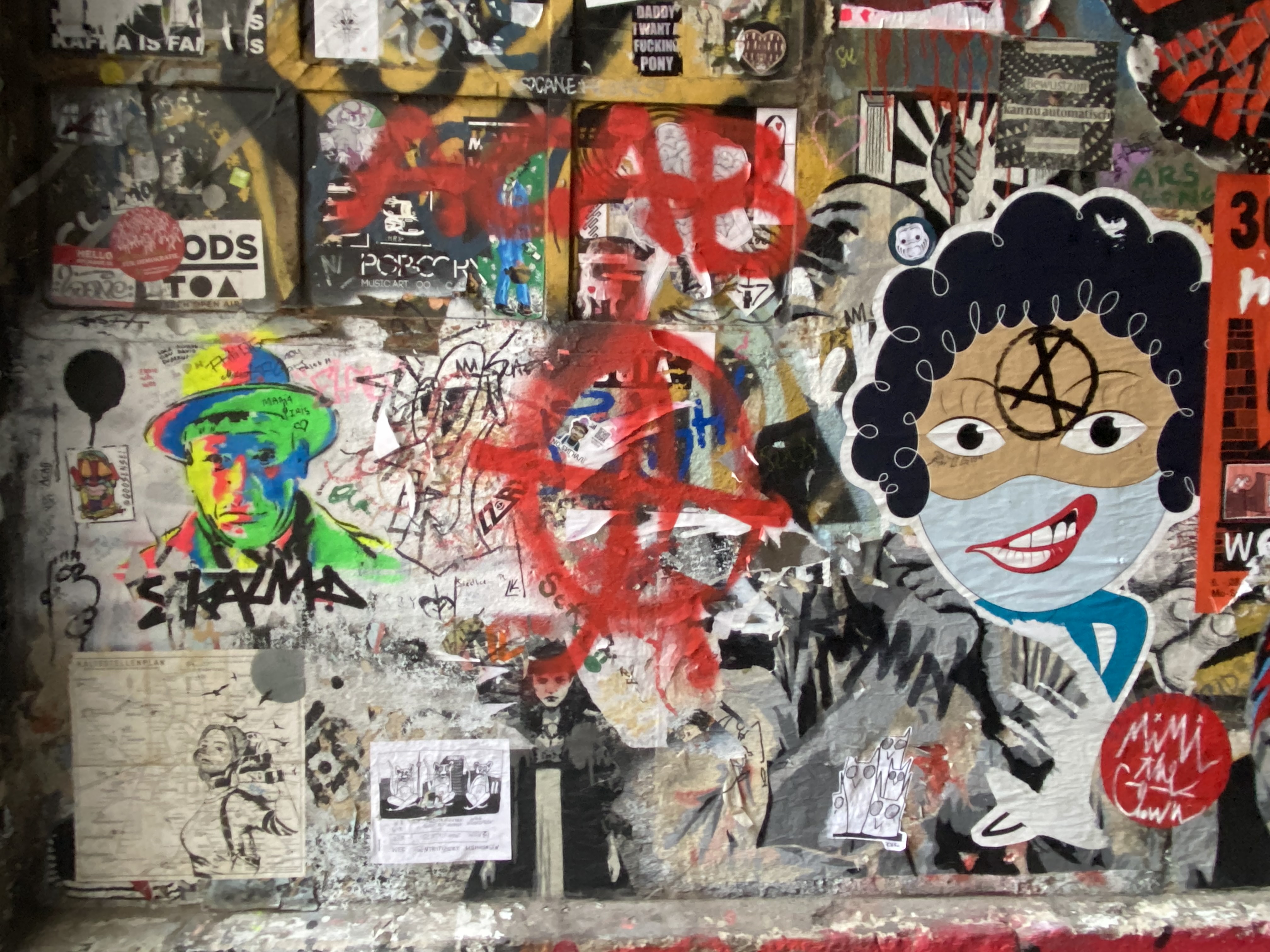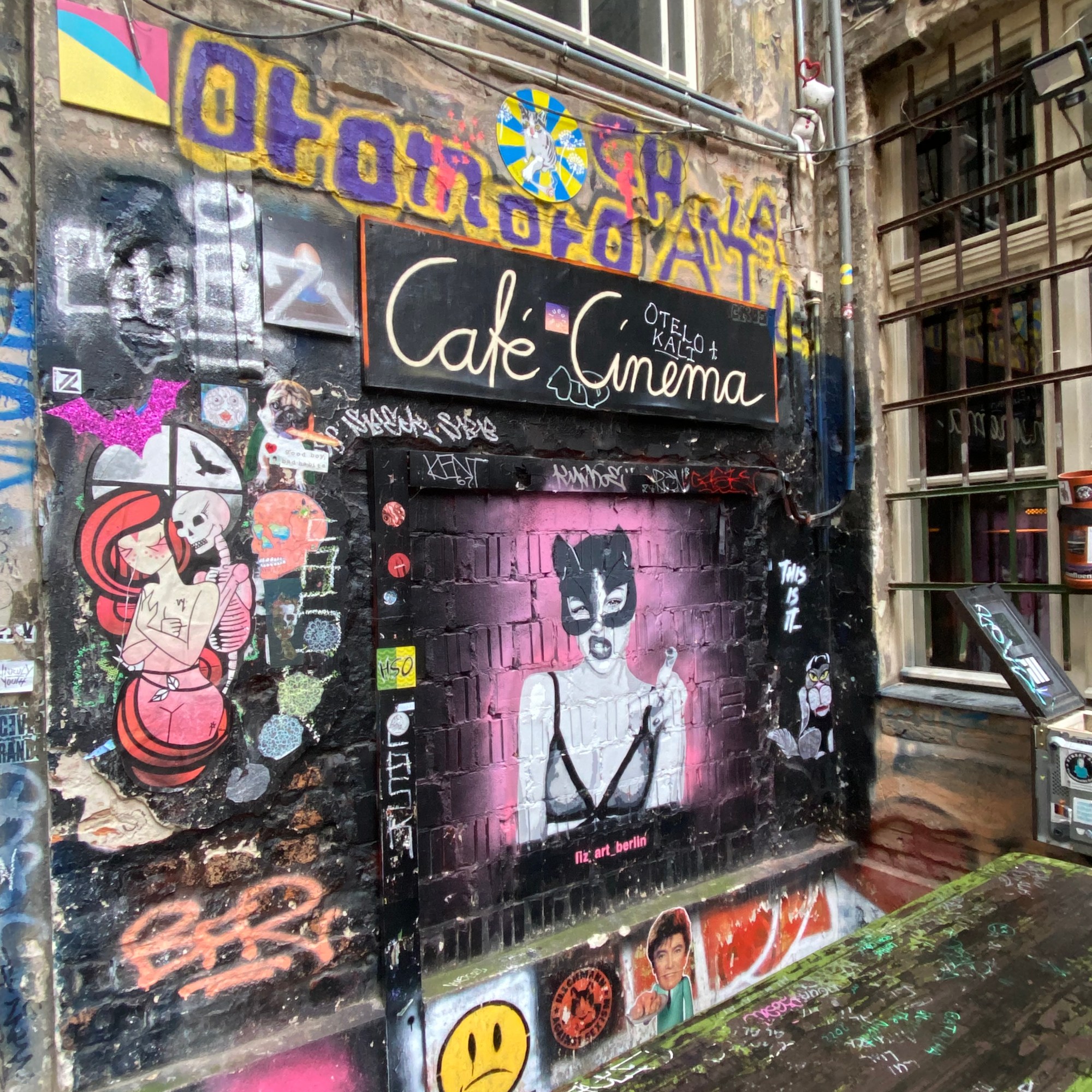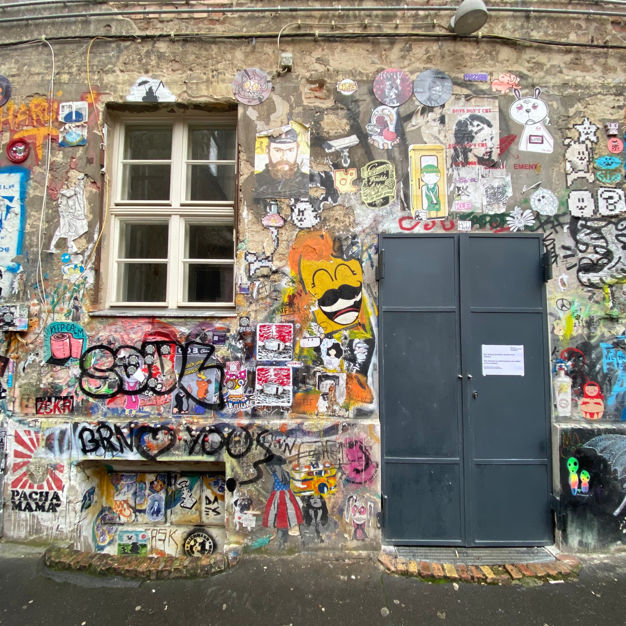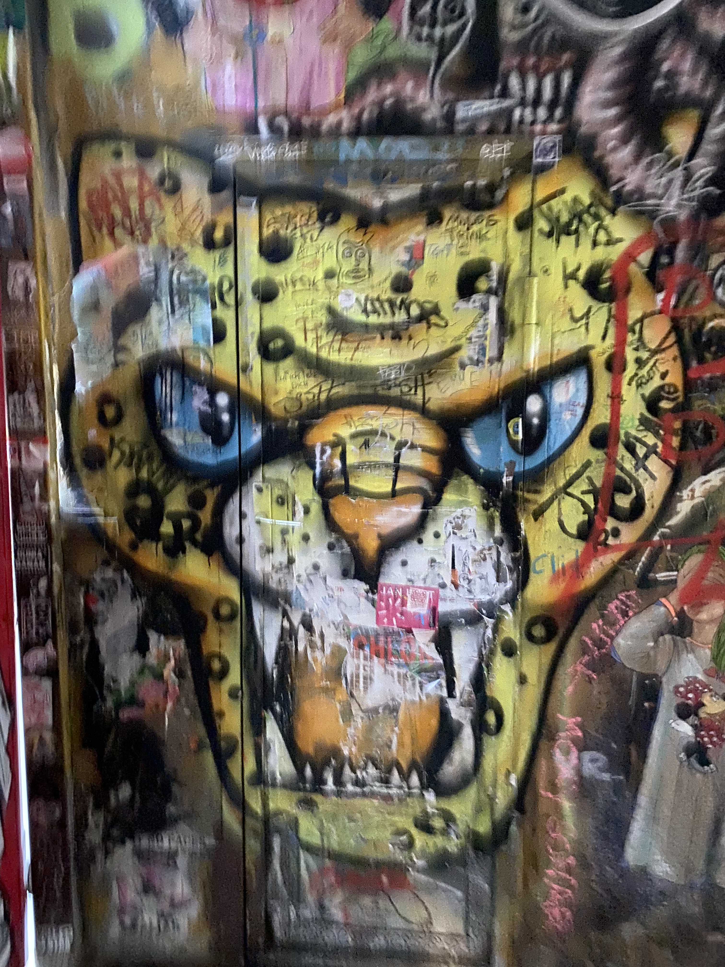 The tunnel is coated with paper and most colorful artwork. The whole yard is a protected space for historic reasons. Painting on the walls is actually illegal; but still the entire right hand side of the yard is covered with Street Art.