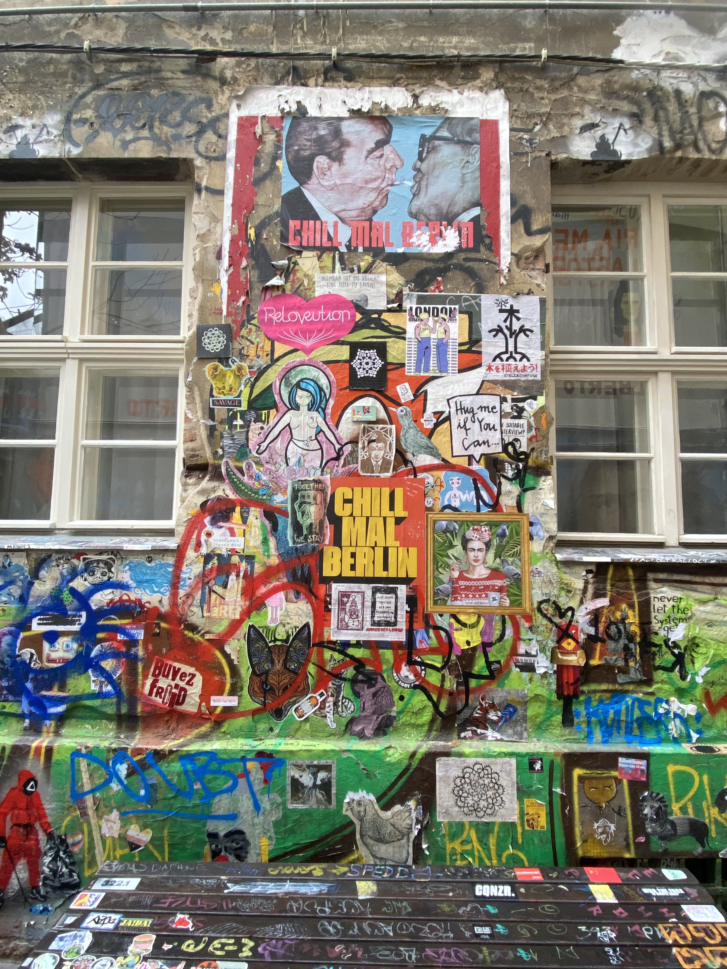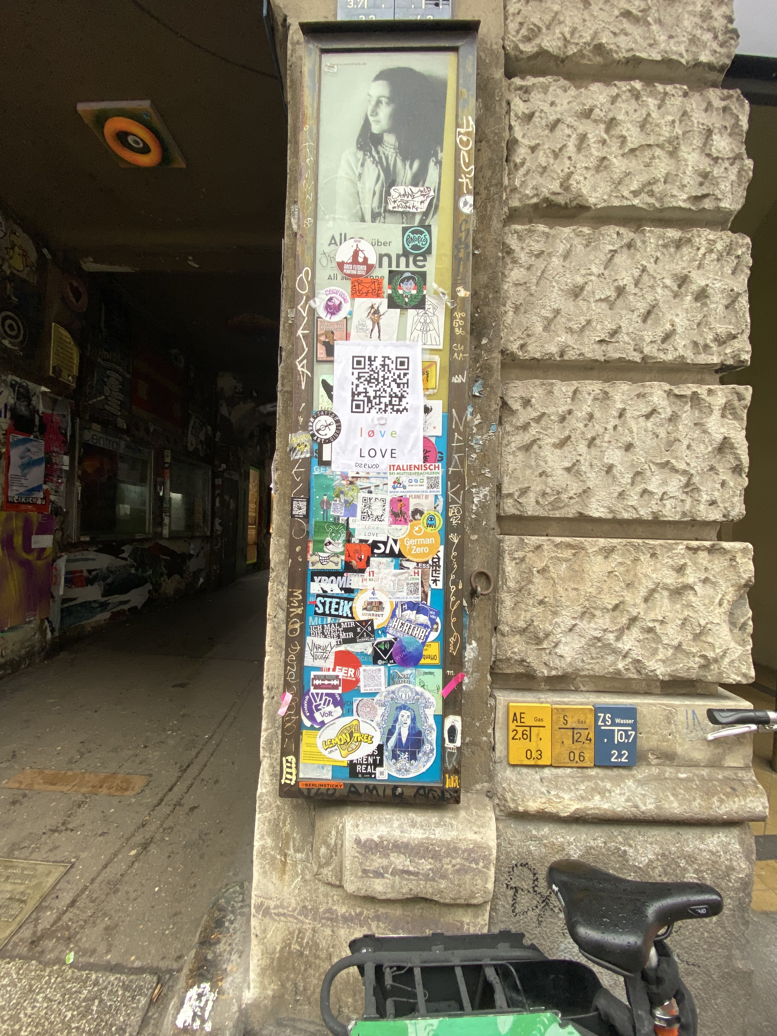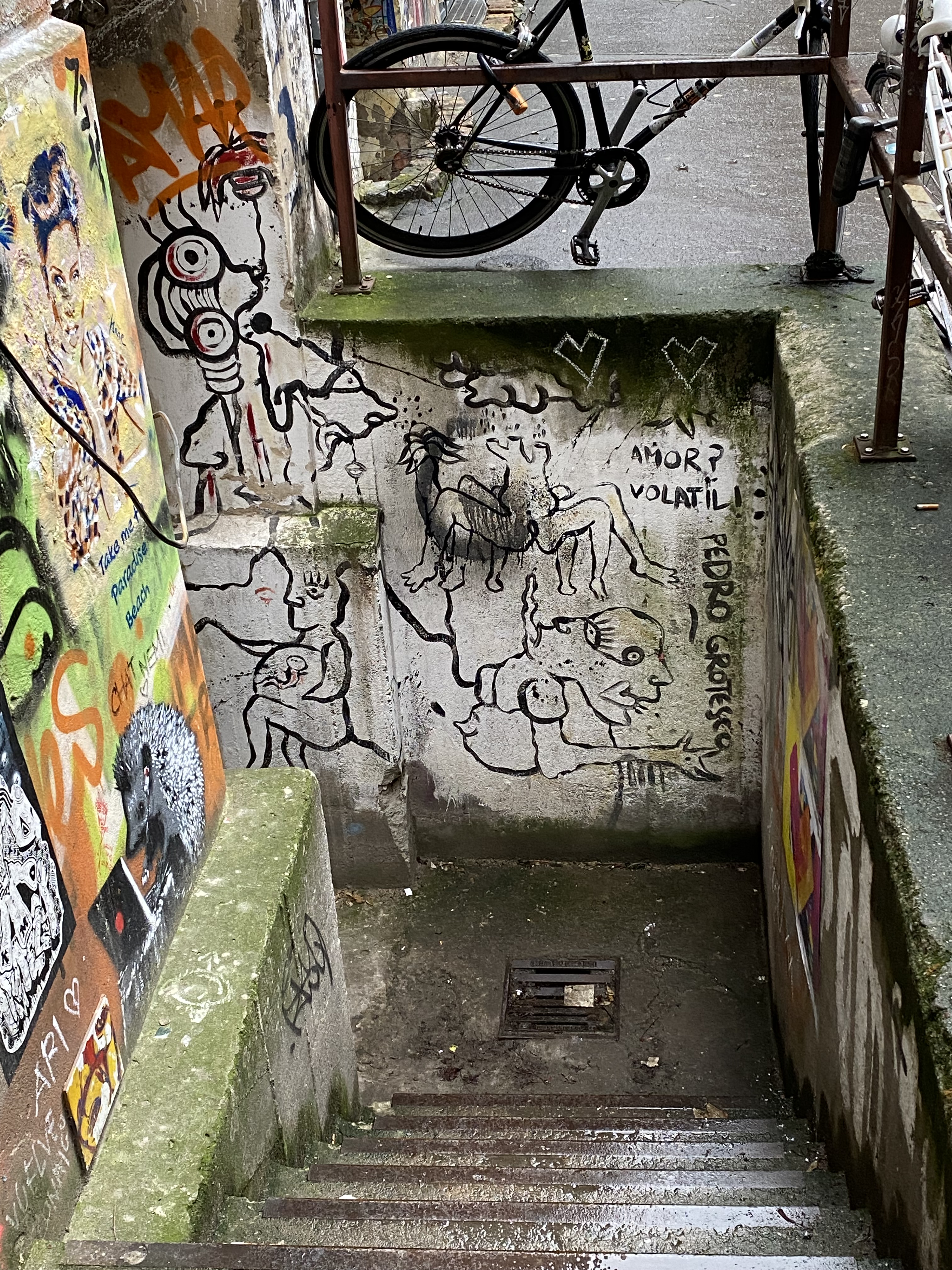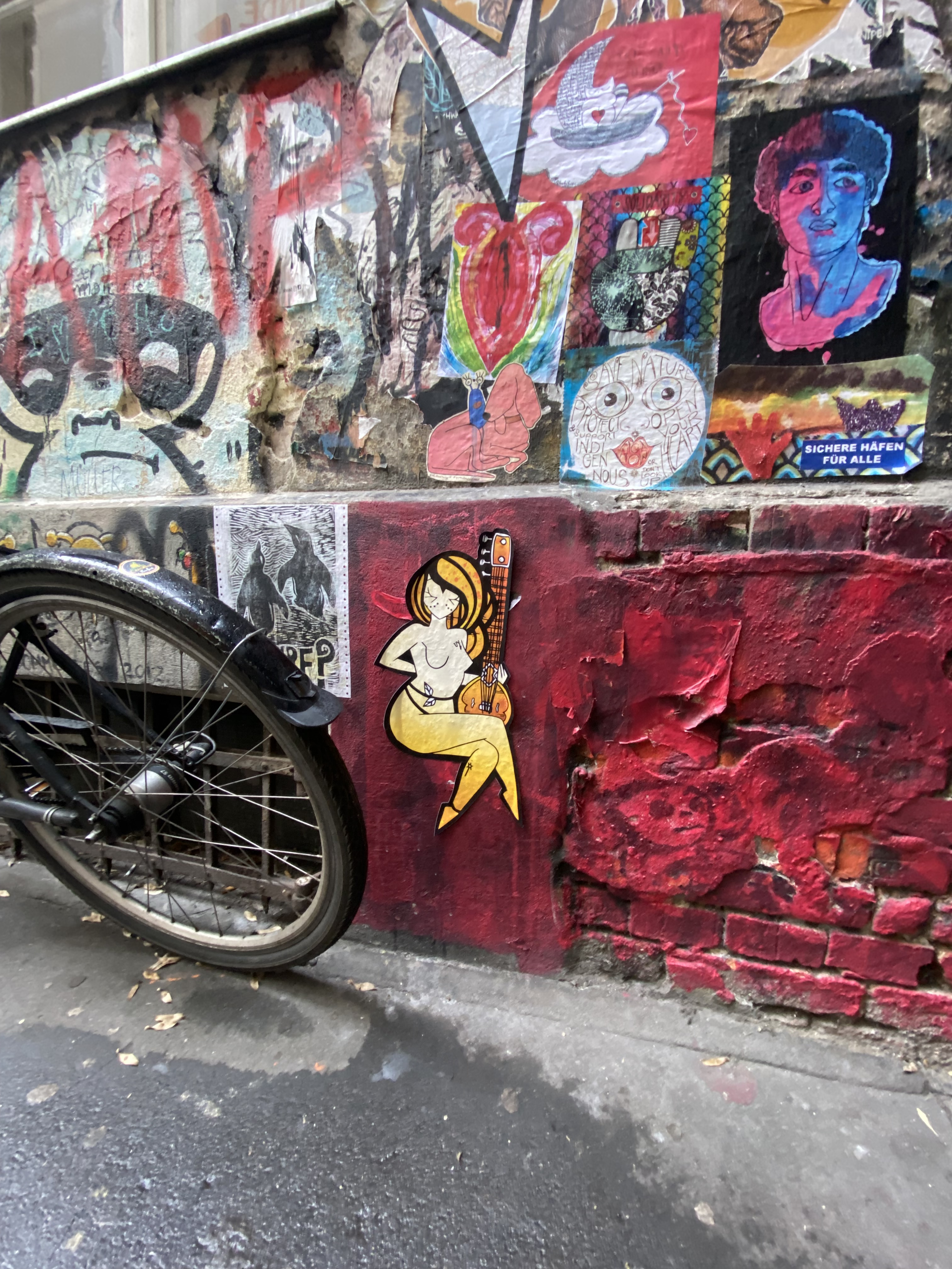 The tunnel is coated with paper and most colorful artwork. The whole yard is a protected space for historic reasons. Painting on the walls is actually illegal; but still the entire right hand side of the yard is covered with Street Art.