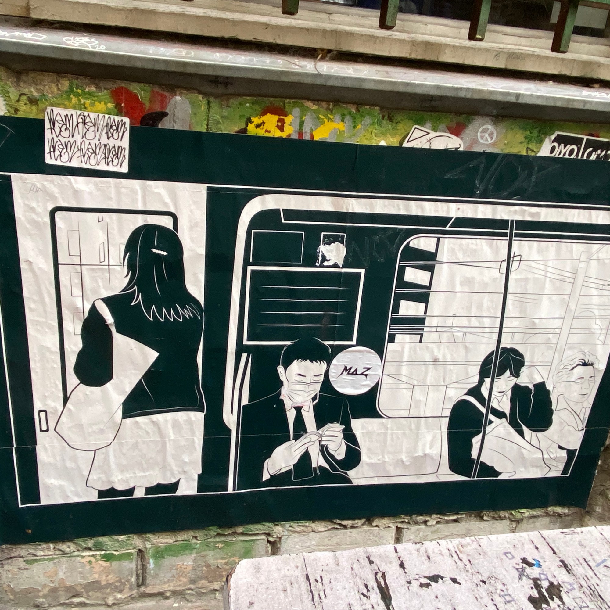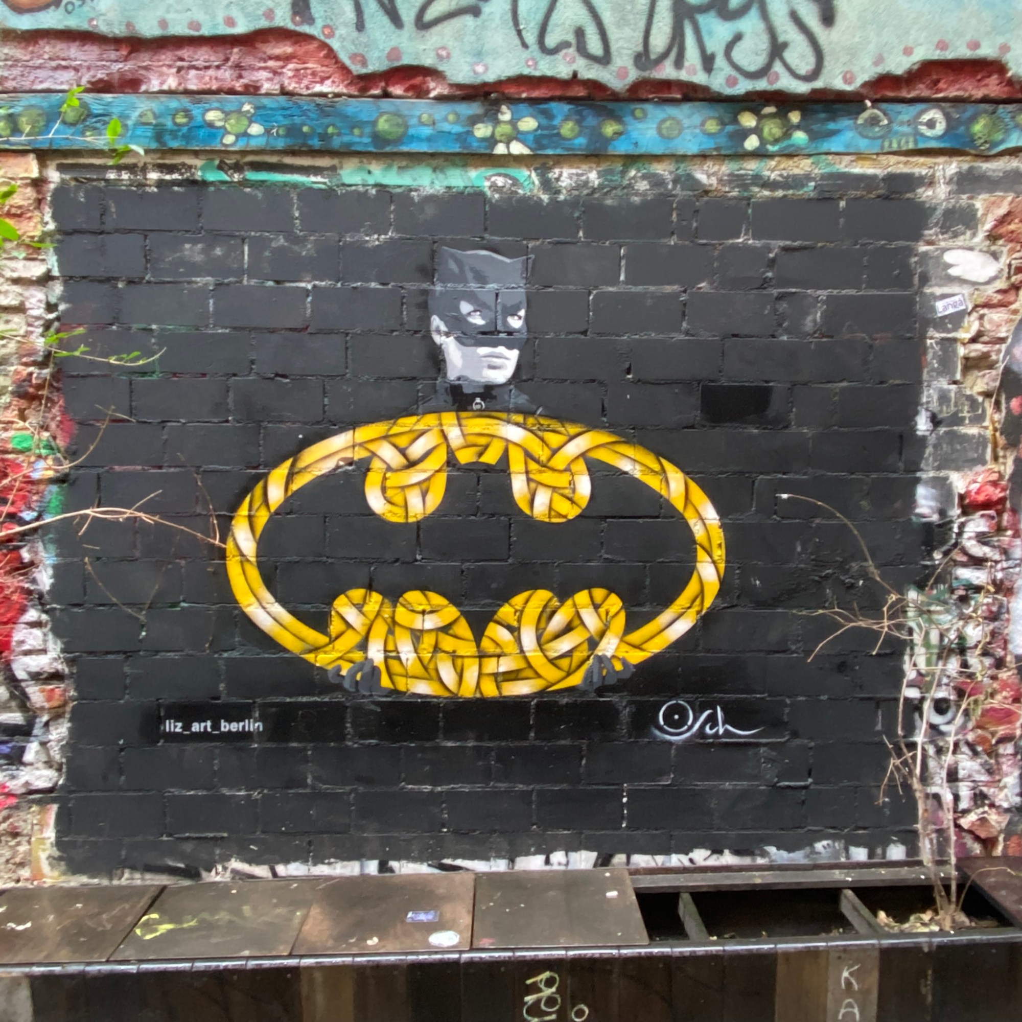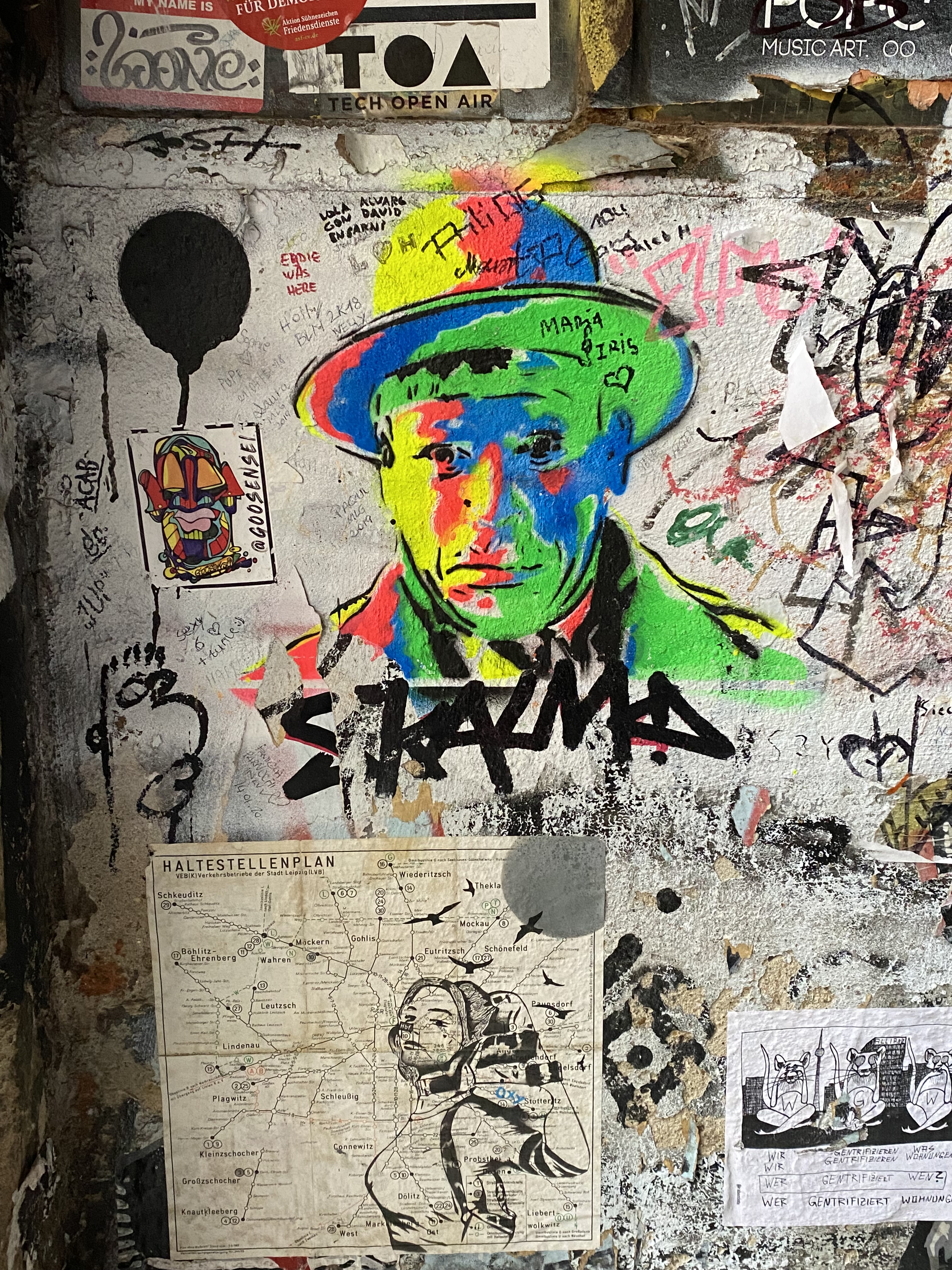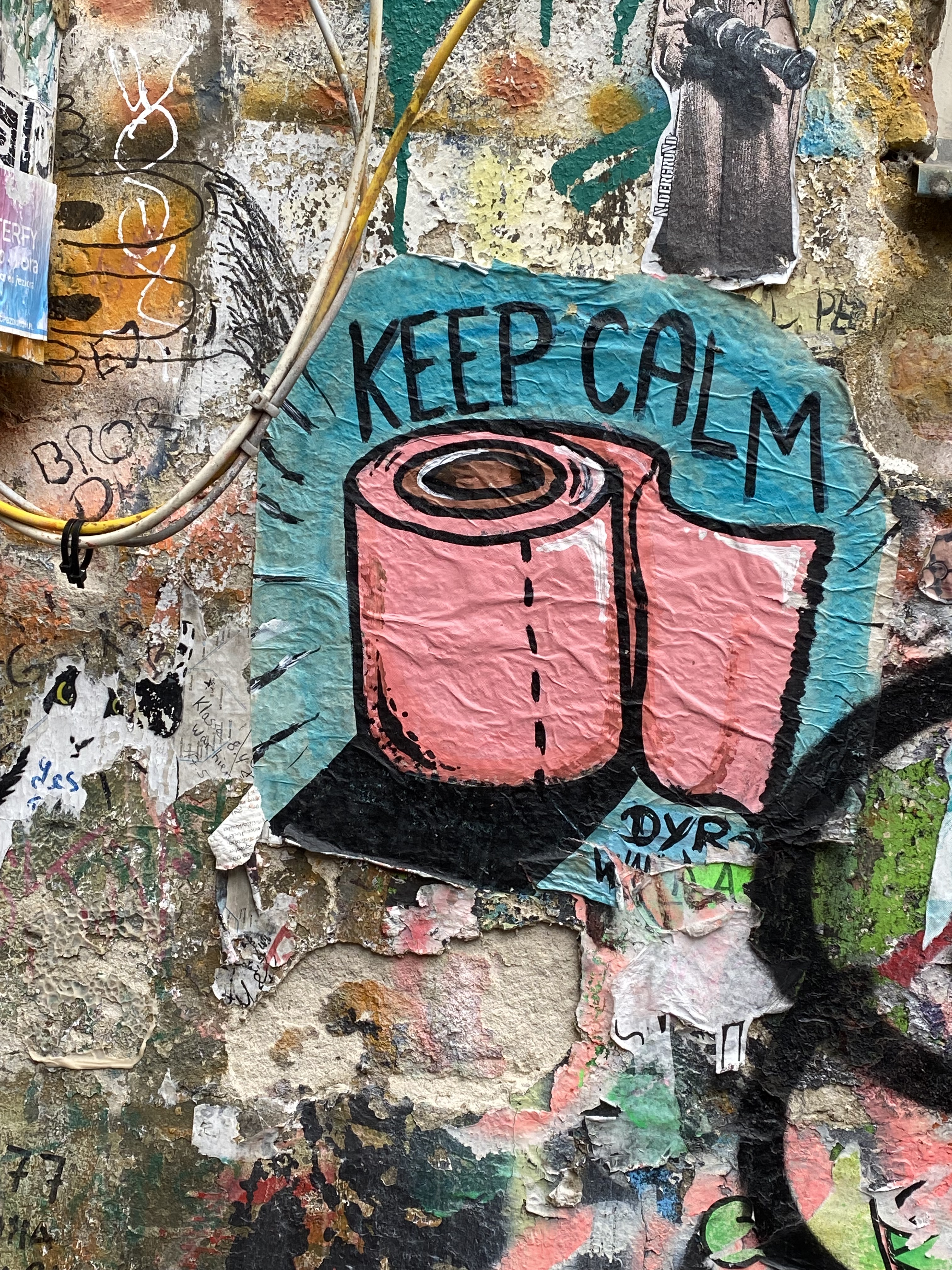 The tunnel is coated with paper and most colorful artwork. The whole yard is a protected space for historic reasons. Painting on the walls is actually illegal; but still the entire right hand side of the yard is covered with Street Art.