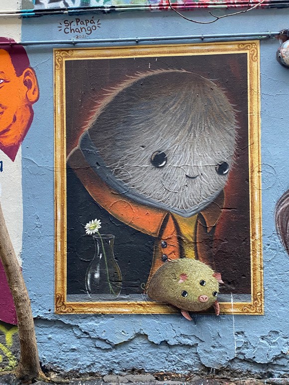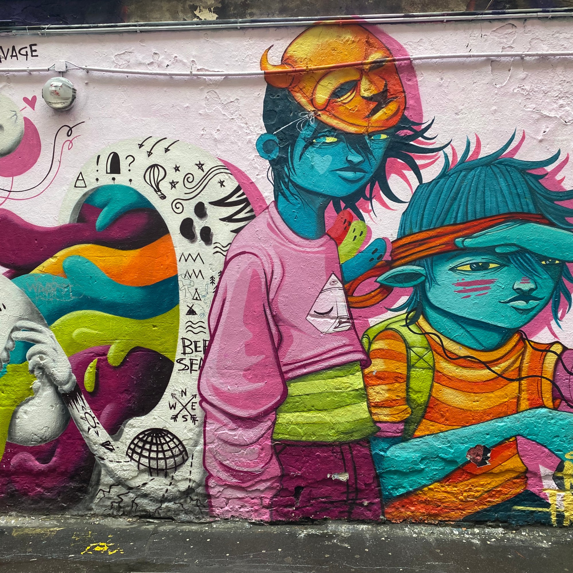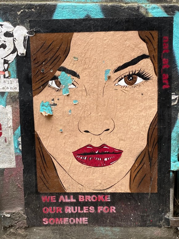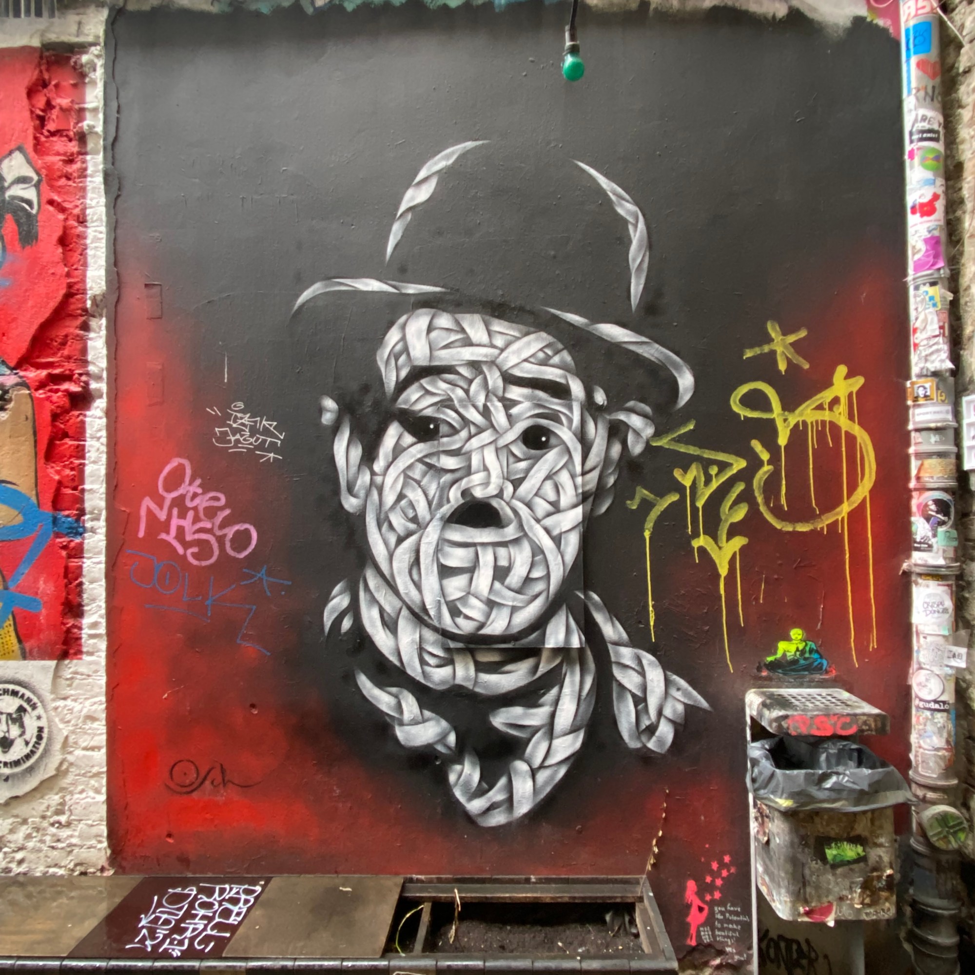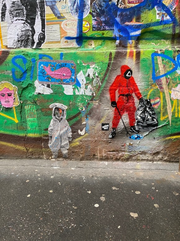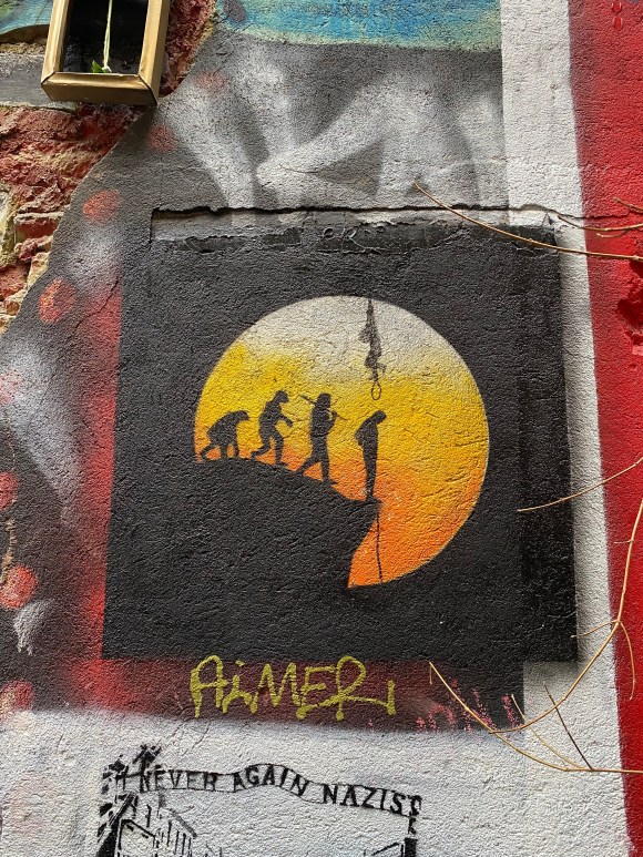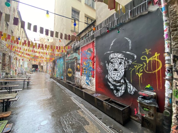 Once you enter the alley, you are being overwhelmed by all the street art, murals, paintings… It is quite the contrast to the very expensive shops and clean walls that can be found in the surrounding.