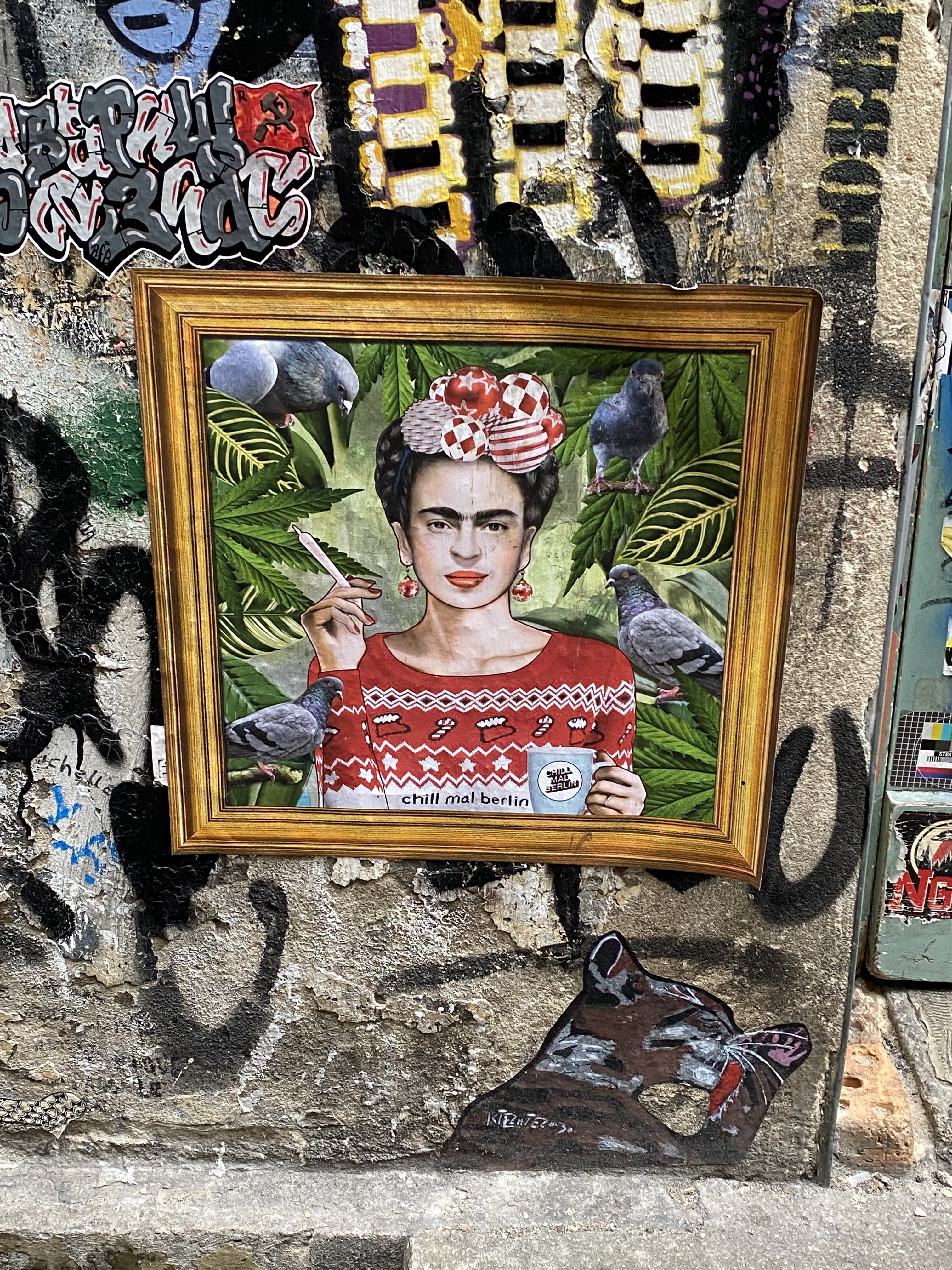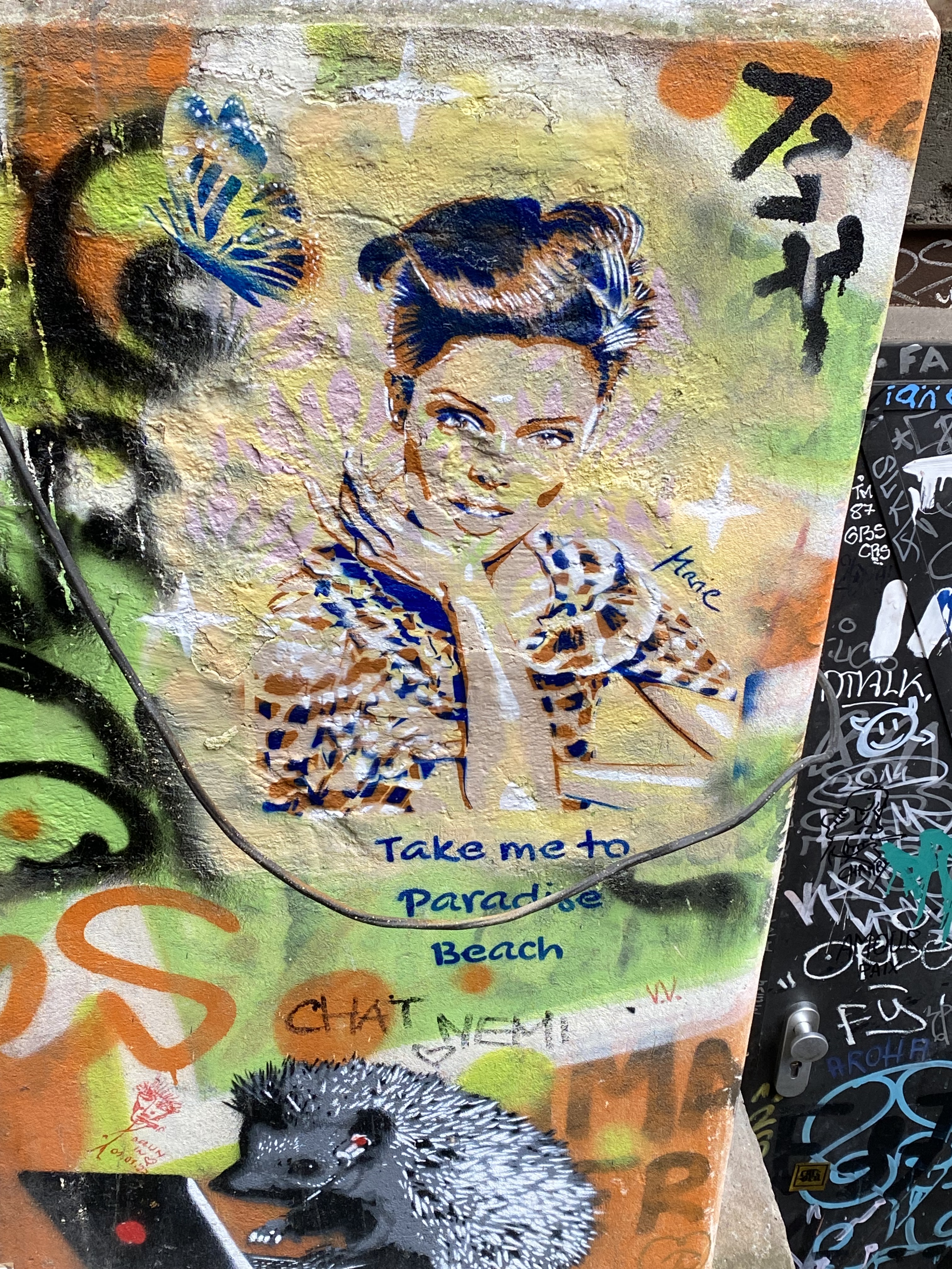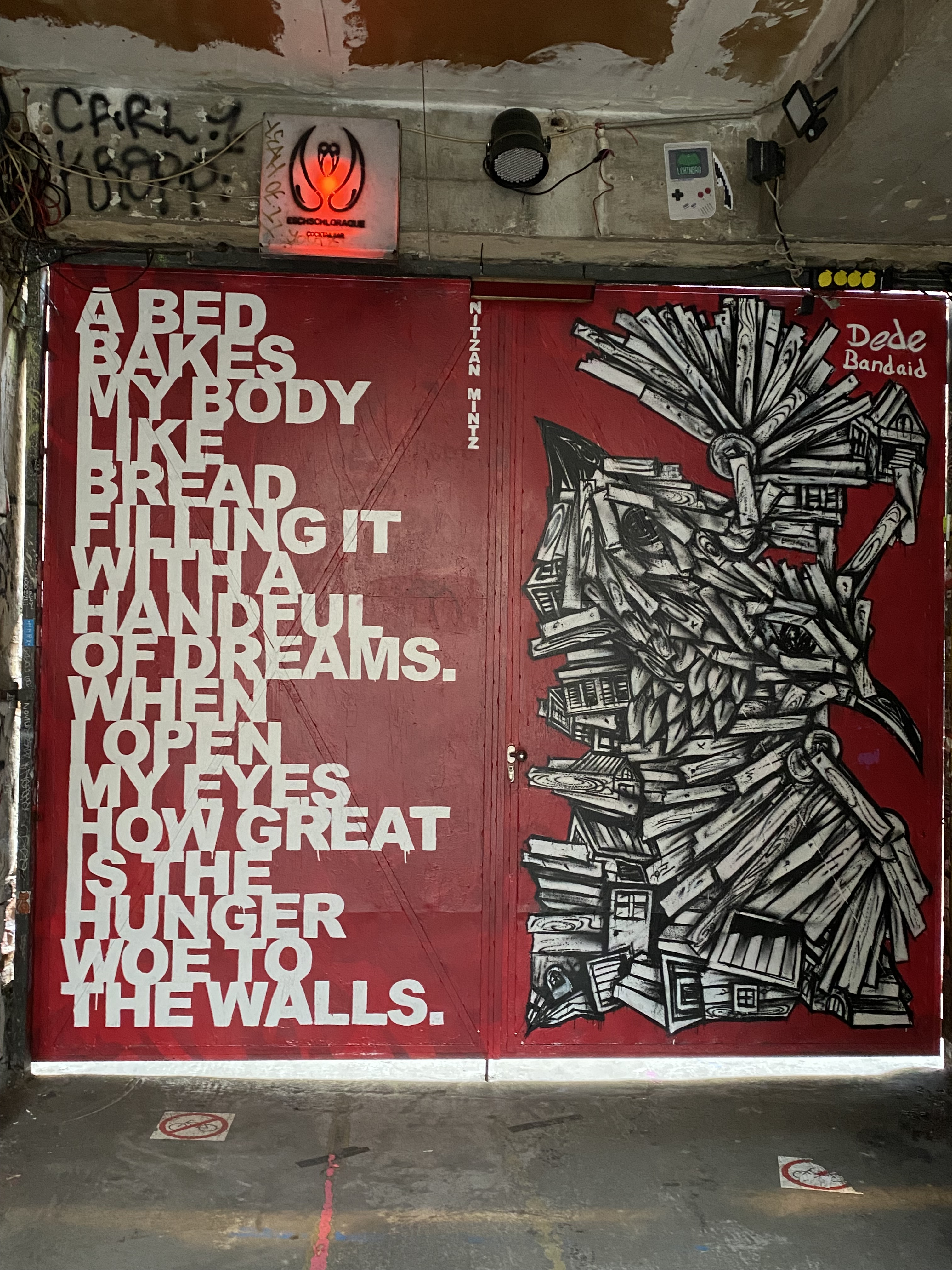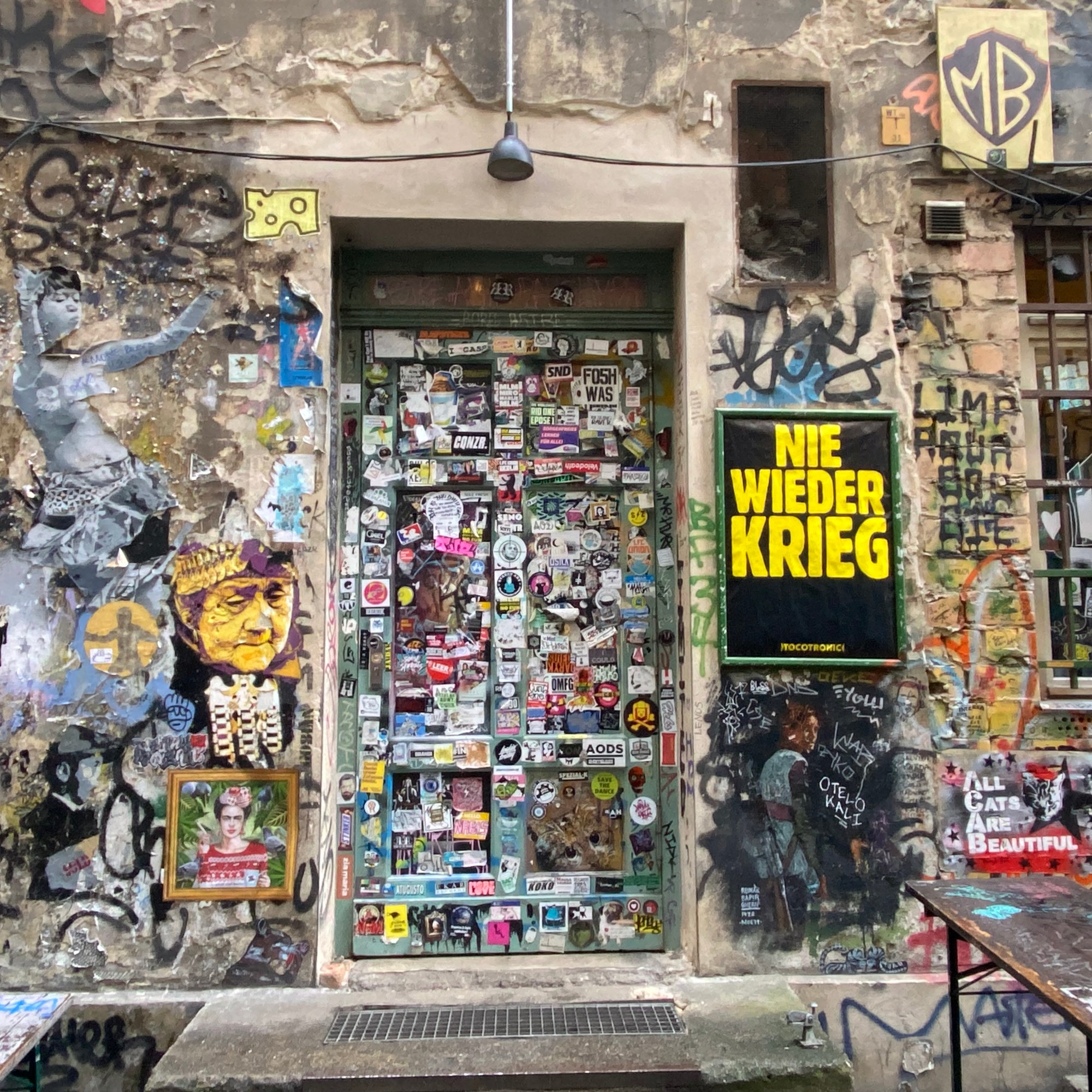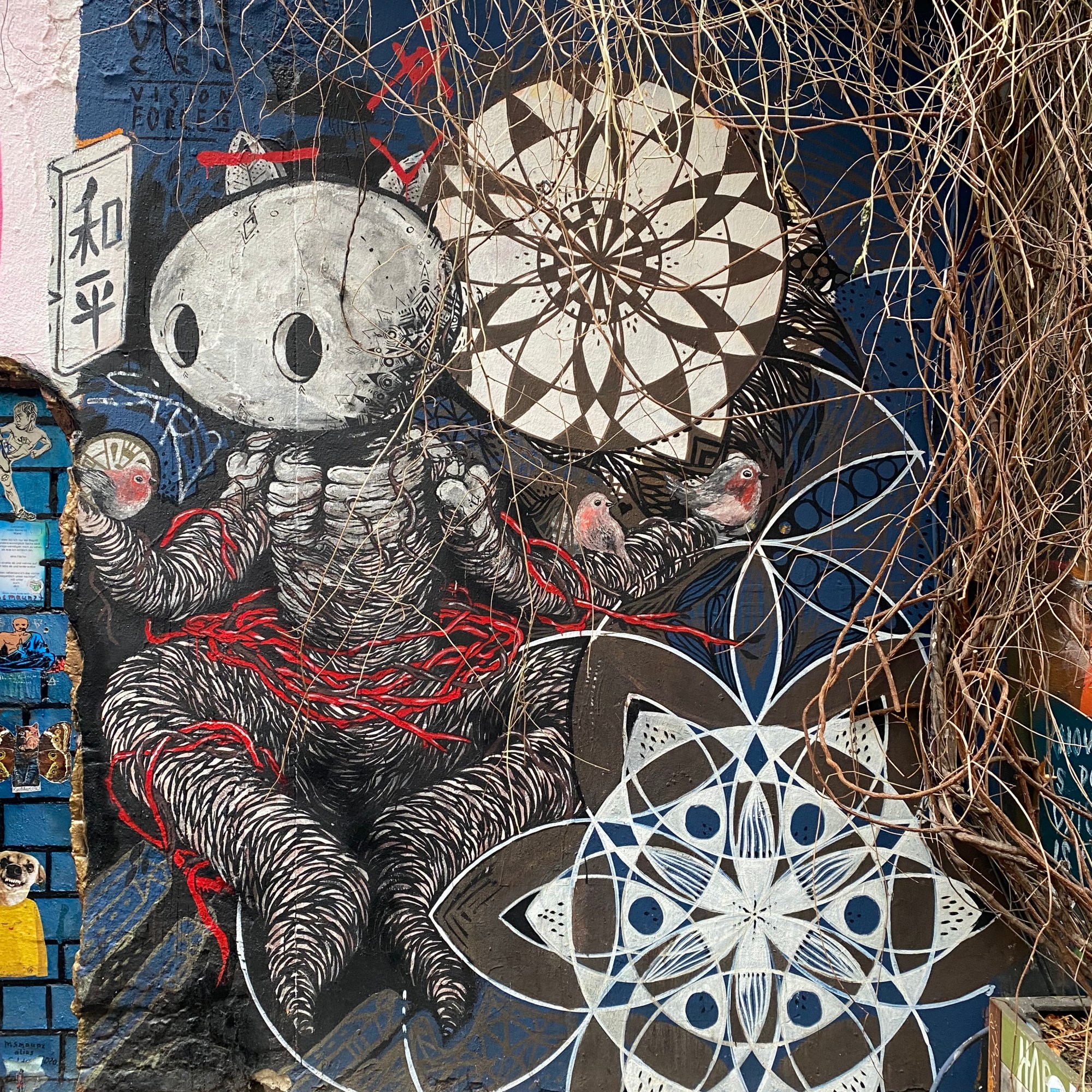 The large walls feature artwork from street artists from all over the world. Works include big paintings, stickers, Paste-Ups, Cut-Outs, stencils, mosaics, installations, guerilla knittings… At the moment you can find works there from international street artists such as: James Cobran aka Jimmy C., Alice Pasquini aka AliCé, Caro Pepe, Otto Schade, The Weird, Reka, Descreet, Alias, El Bocho, Sr. Papá Chango, Plotbon KEN, Tona, Patera, Emess, Herr von Bias (HRvB), Prost, Joy Foc, Robi the Dog, Various & Gould, Soon, Mymo, Rallitox, Lake Oner…