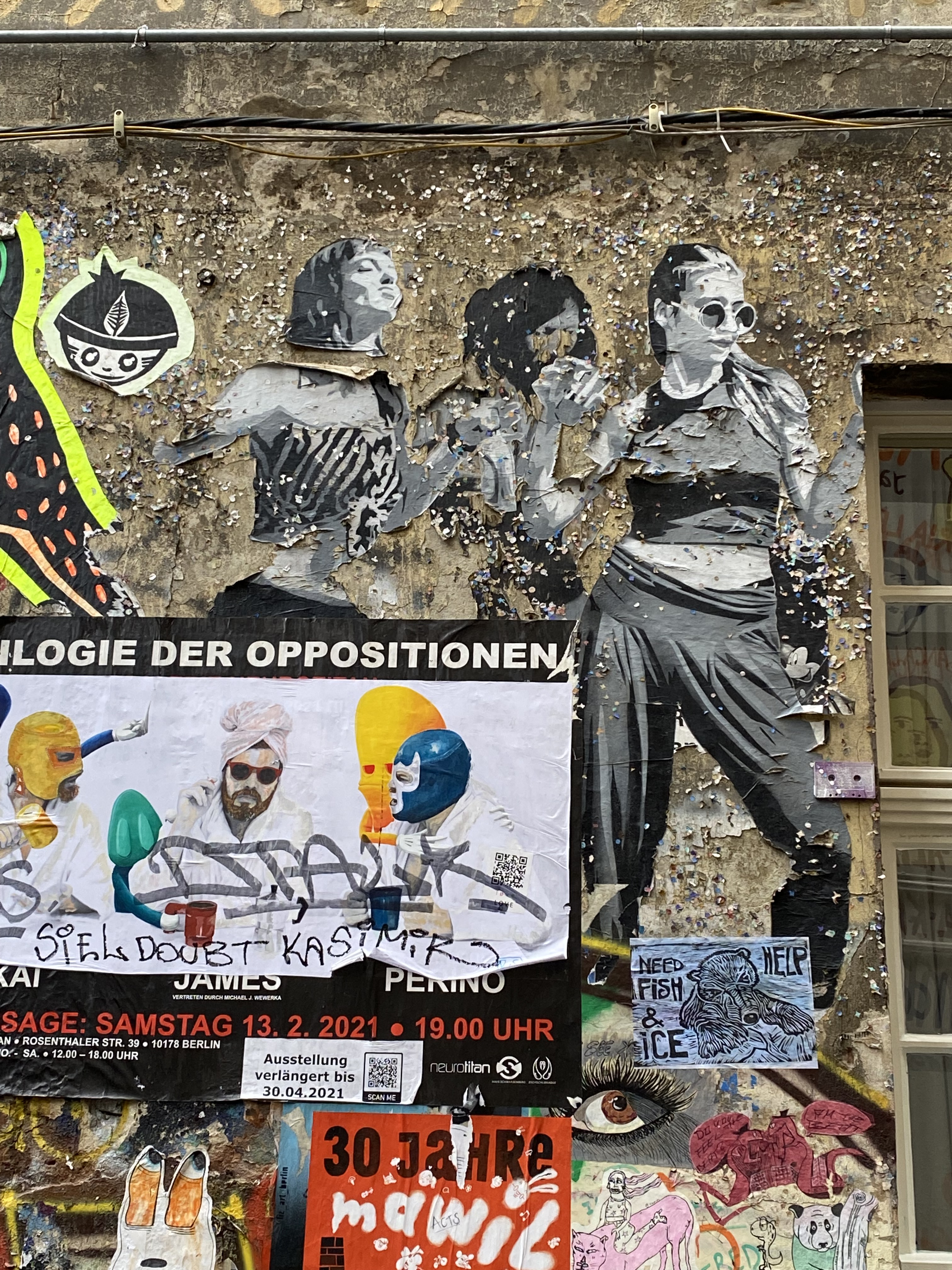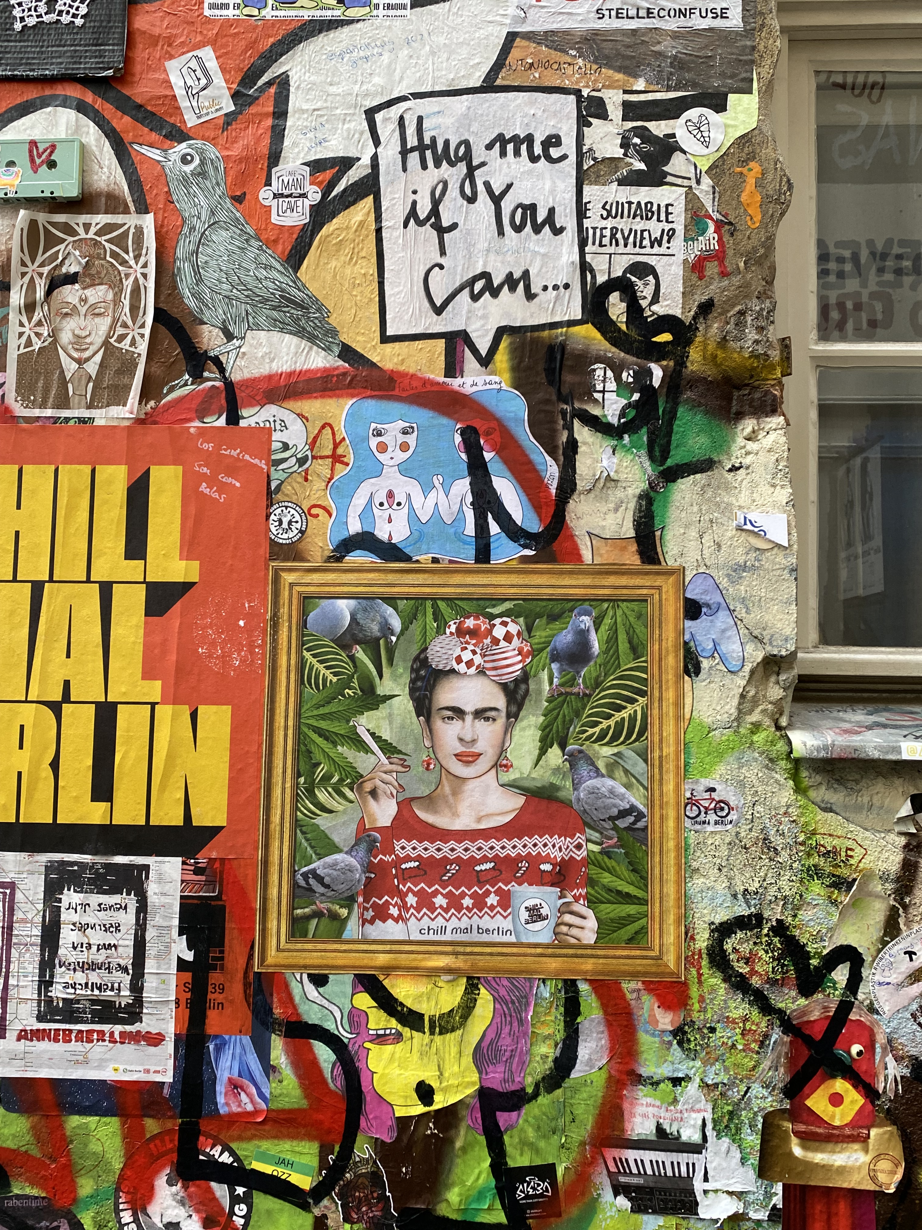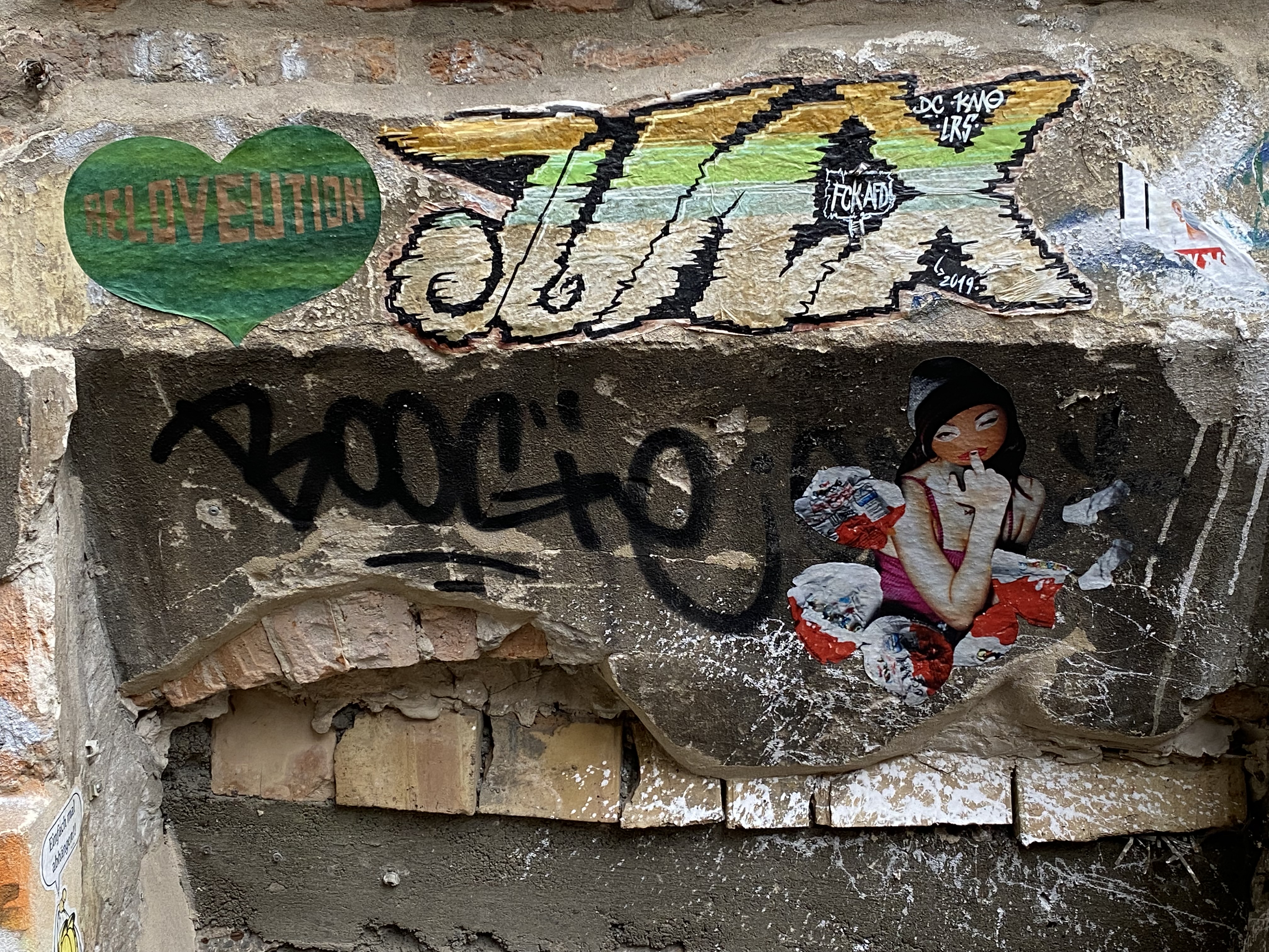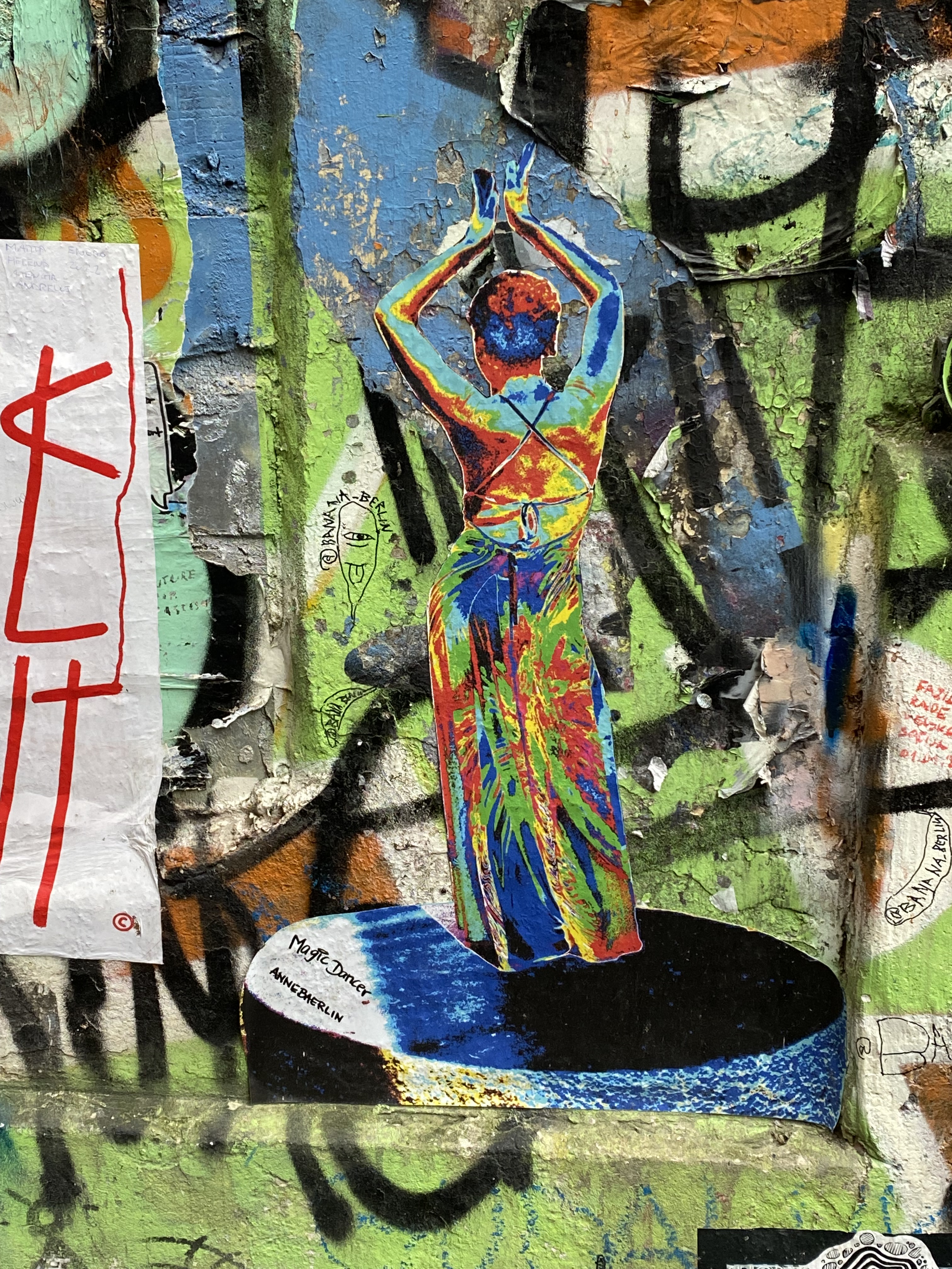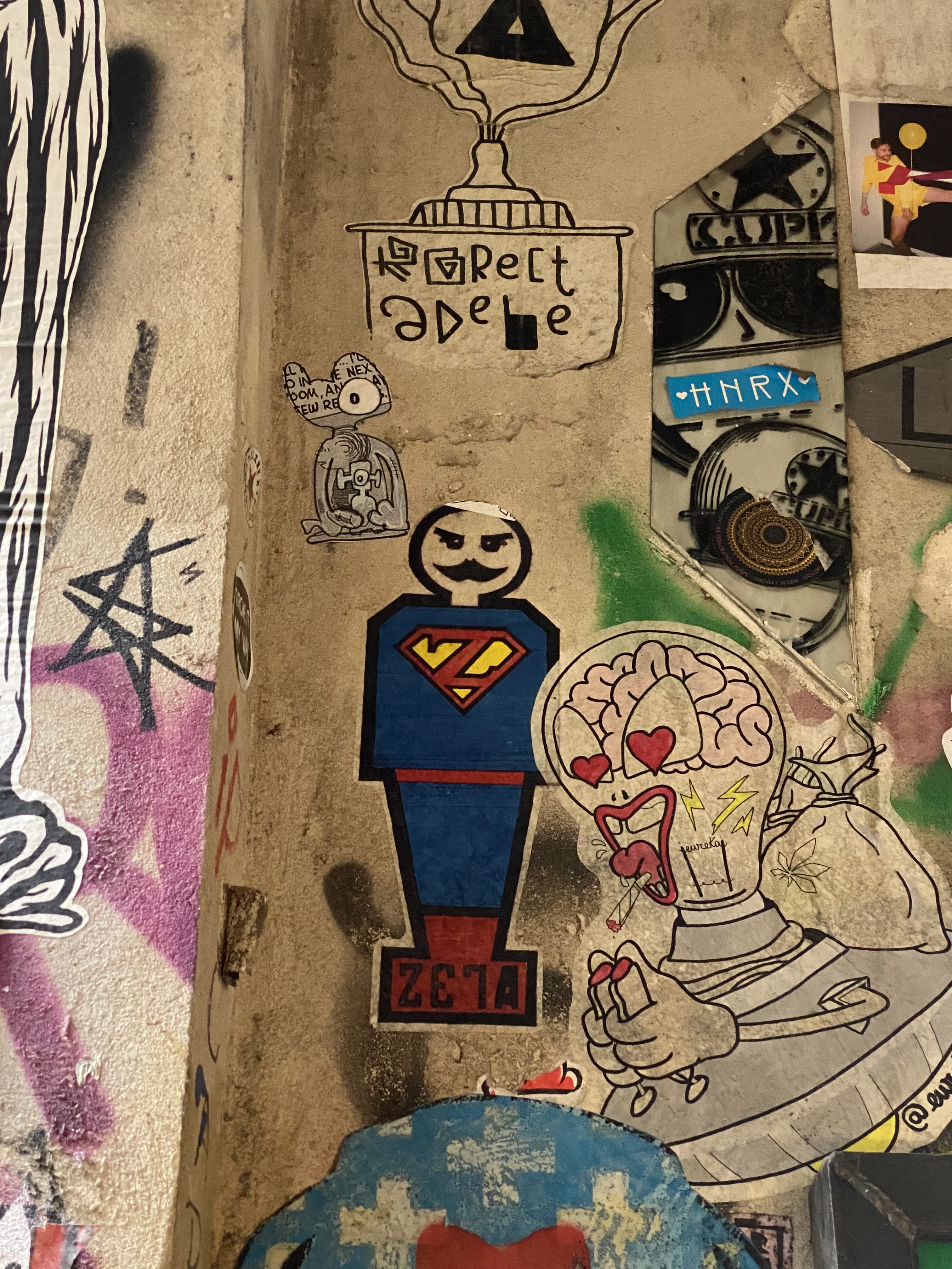 The large walls feature artwork from street artists from all over the world. Works include big paintings, stickers, Paste-Ups, Cut-Outs, stencils, mosaics, installations, guerilla knittings… At the moment you can find works there from international street artists such as: James Cobran aka Jimmy C., Alice Pasquini aka AliCé, Caro Pepe, Otto Schade, The Weird, Reka, Descreet, Alias, El Bocho, Sr. Papá Chango, Plotbon KEN, Tona, Patera, Emess, Herr von Bias (HRvB), Prost, Joy Foc, Robi the Dog, Various & Gould, Soon, Mymo, Rallitox, Lake Oner…