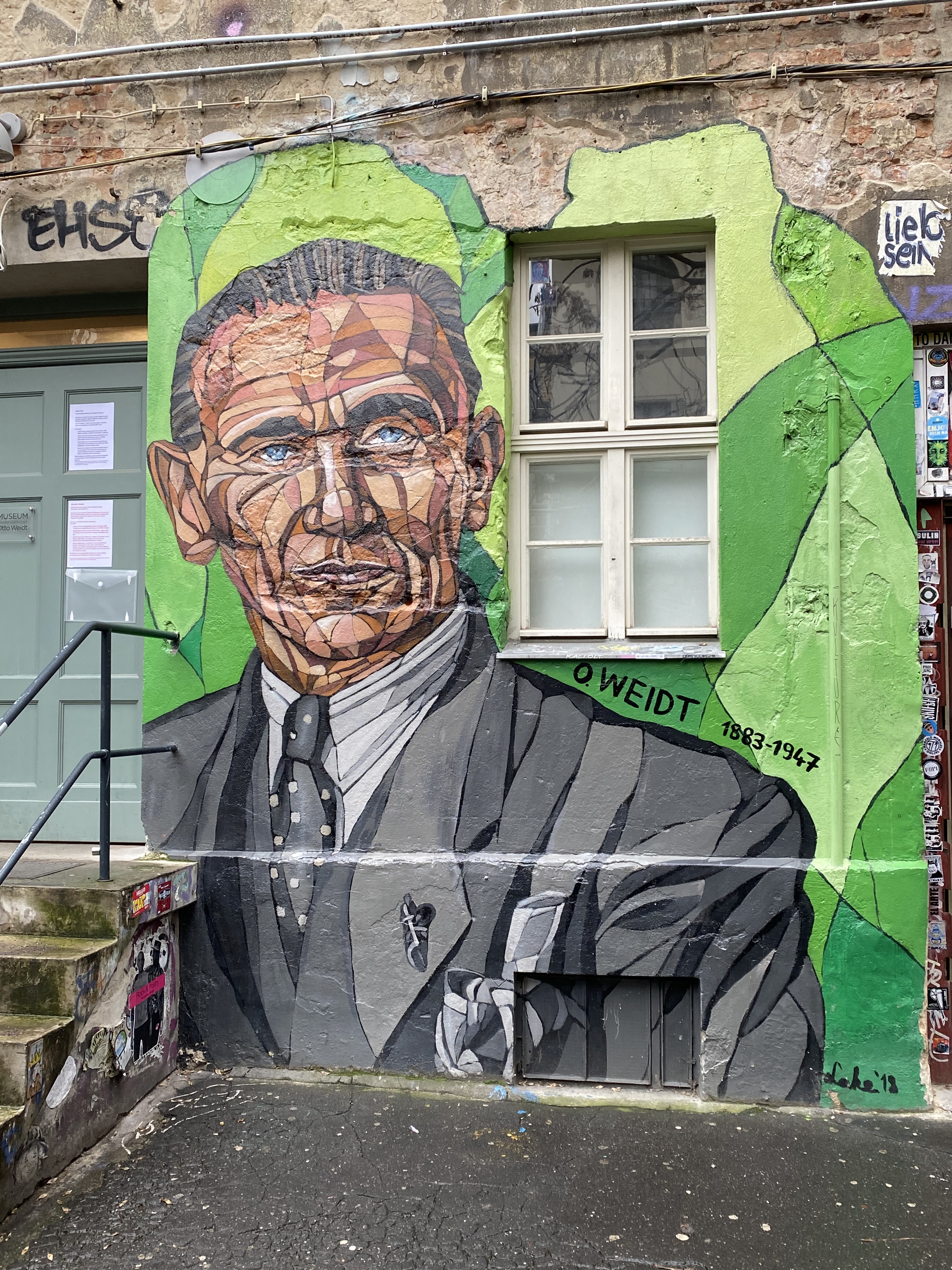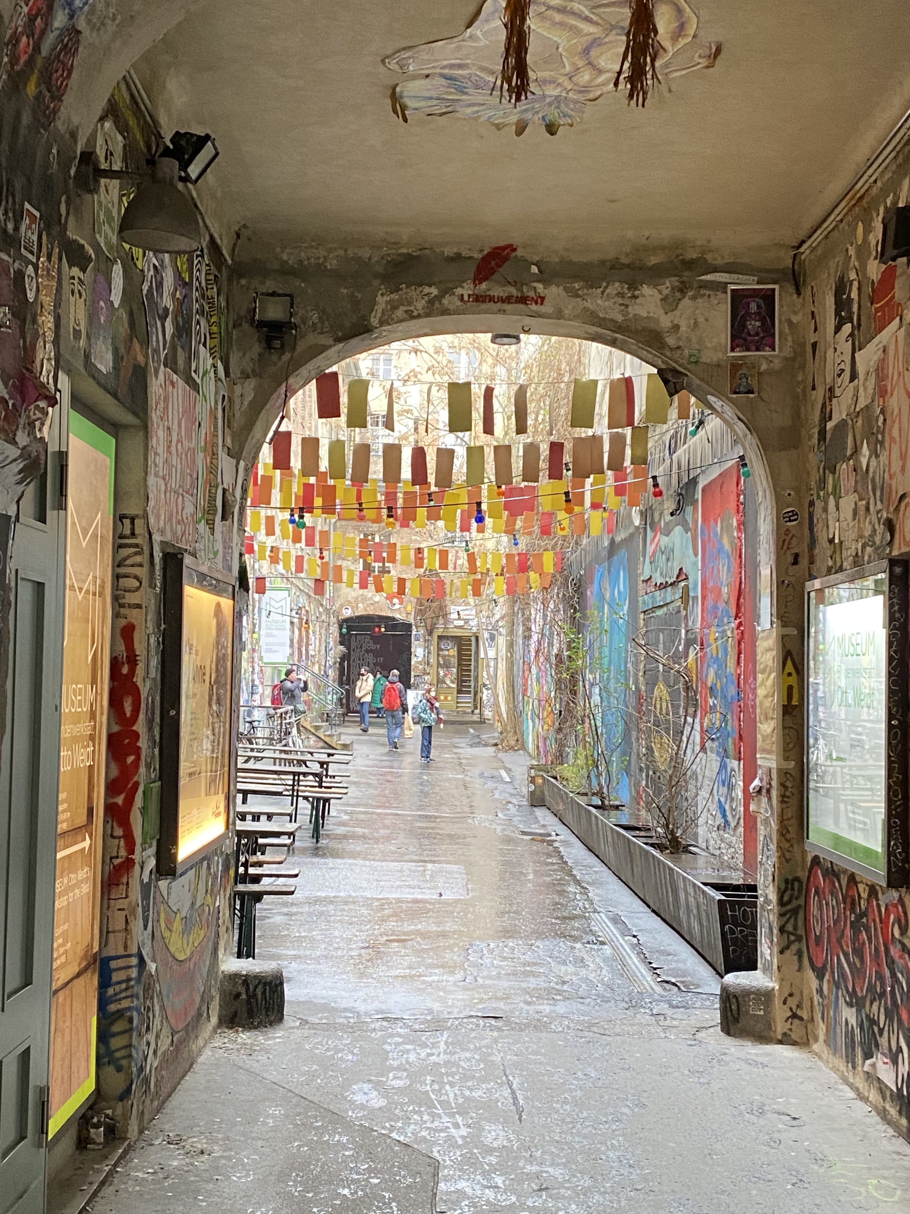The tunnel is coated with paper and most colorful artwork. The whole yard is a protected space for historic reasons. Painting on the walls is actually illegal; but still the entire right hand side of the yard is covered with Street Art.