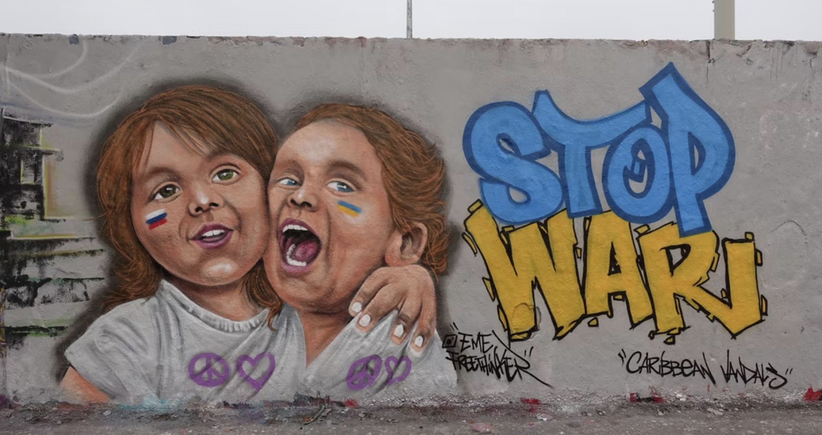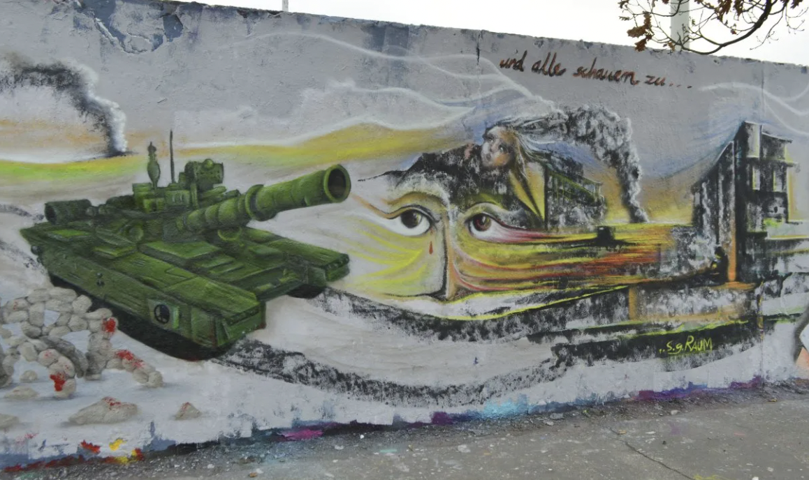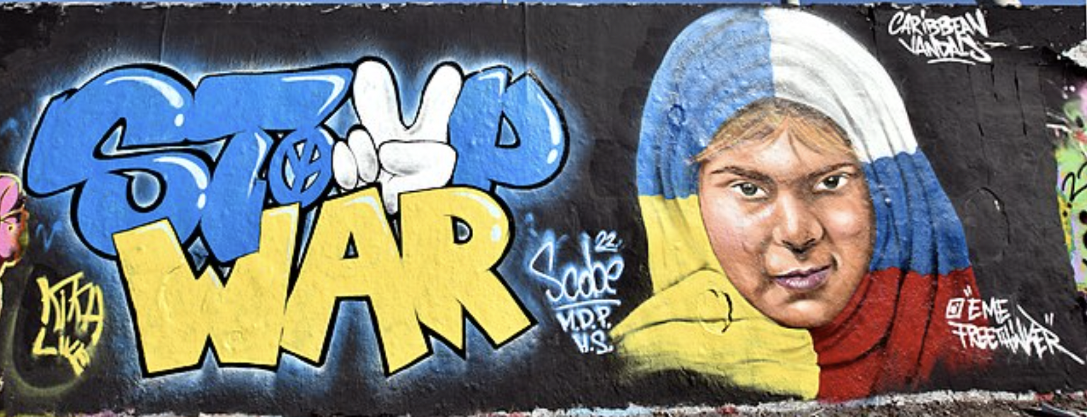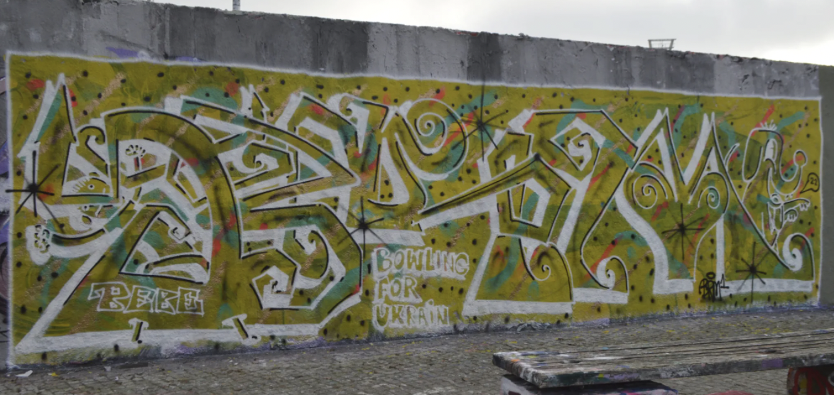 Many street artists show their solidarity with Ukraine by creating murals and graffitis in Berlin. Find art of Arte Vilu, Chuck, Pinup, Edga, Suga Art Berlin, S.G. Raum, and Eme Freethinker.